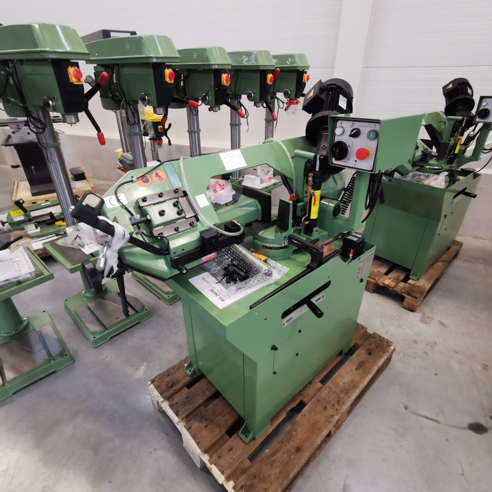 eladó egy kicsi helyigényű, fix telepítésű szalagfűrész új állapotban (bemutató darab). A gépen gyorsszorítós satu van és gérben lehet vele vágni.